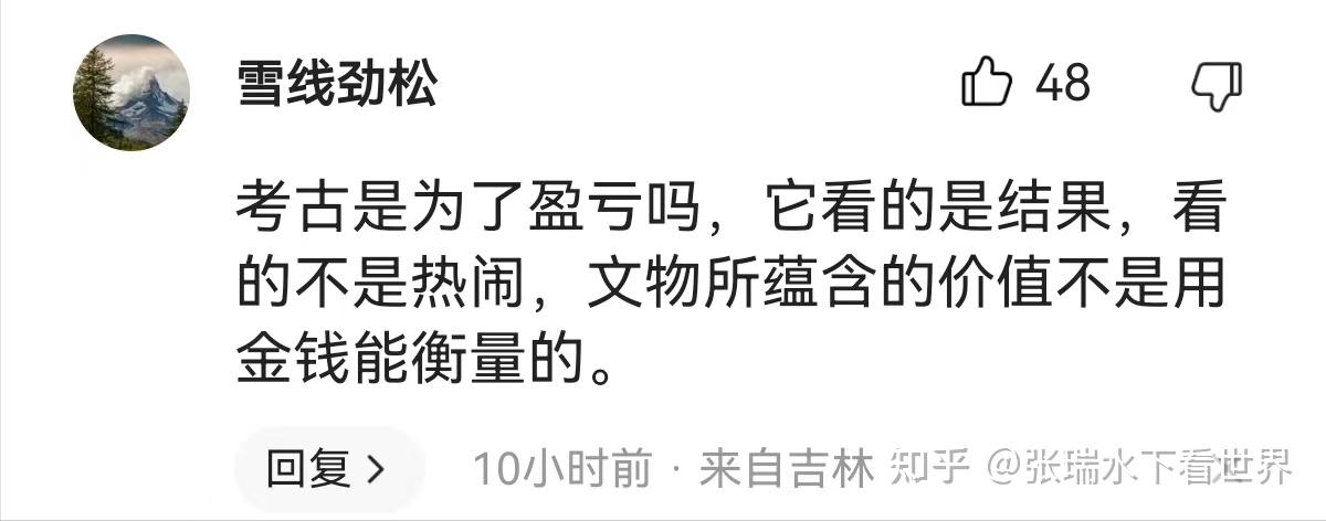 当然也有更加理性的朋友直接了当地教育我:“考古是为了盈亏吗?它看的是结果,看得不是热闹,文物所蕴含的价值不是用金钱能衡量的。”
