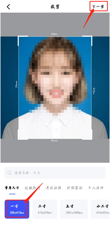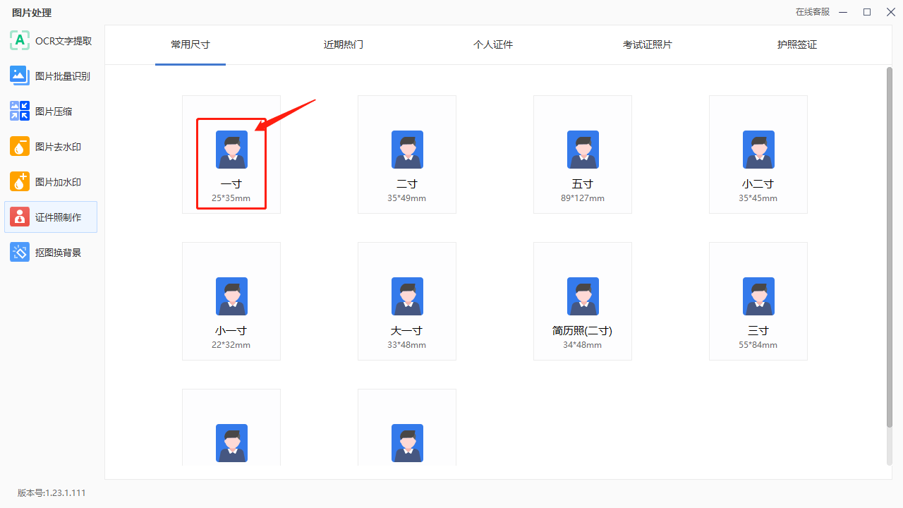在尺寸选择的页面里选择一寸,然后上传需要裁剪尺寸的证件照片。
