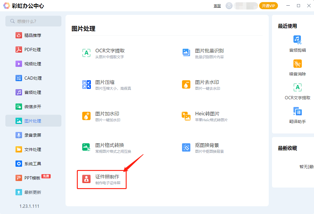 我们打开软件之后,先点击进入【图片处理】页面,然后找到【证件照制作】点击打开。