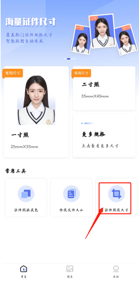 我们打开软件后就可以看到如下图的页面,然后找到其中的【证件照改尺寸】功能点击打开。
