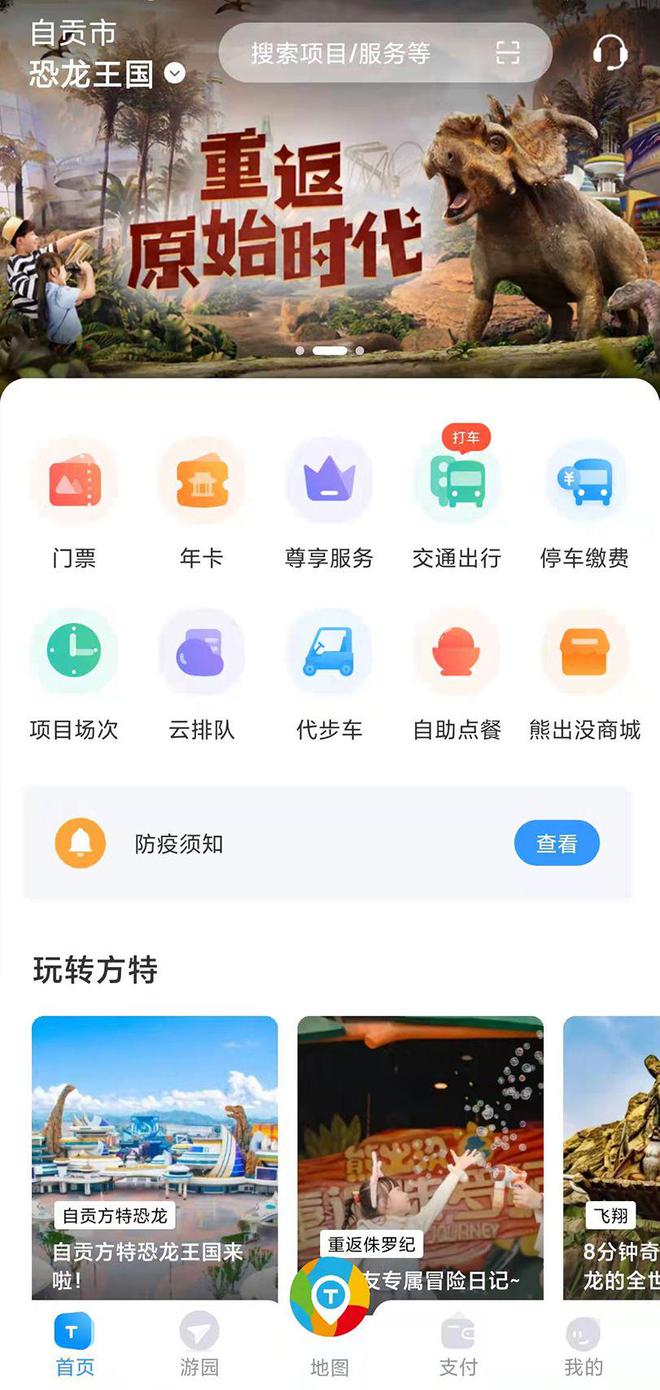 装好方特旅游app,可以开始游园了。入园后先到右手边的《飞上蓝天》门口预约云排队,这是自贡方特最好的剧场项目(朋友们一致认同),魔球的表现力非常震撼。预约以后在开场前会提前通知入场,此时我们可以赶紧去右前方的《恐龙危机》。