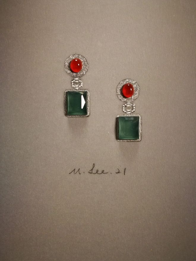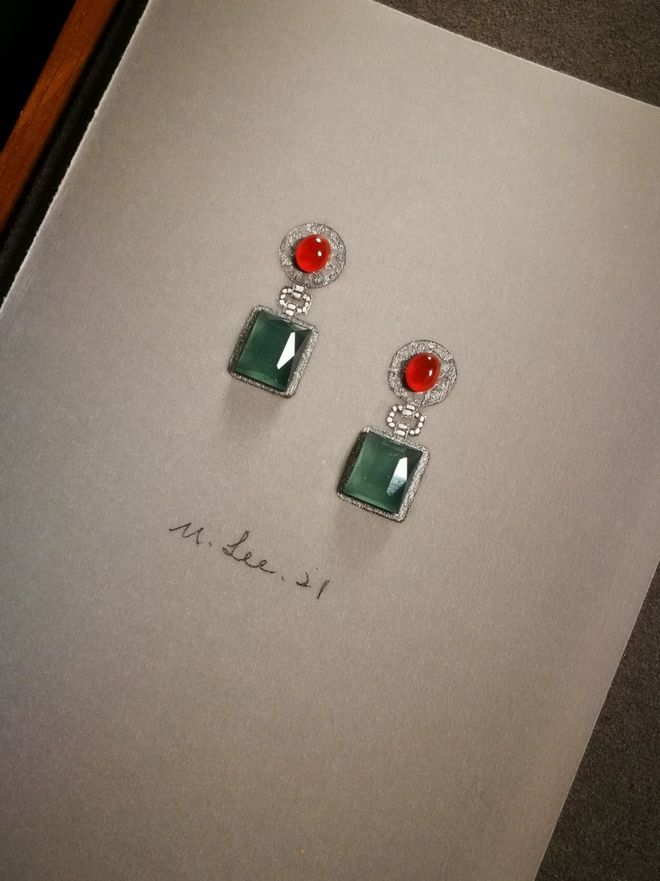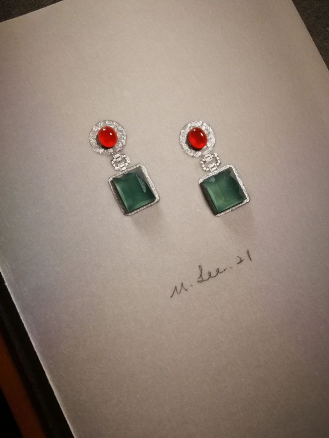 红与蓝,一种清冷、疏离的外表,却蕴含着炽热、丰富的内心。当你穿上一件纯白色的毛衣,佩戴着这对翡翠耳坠,她就是你。