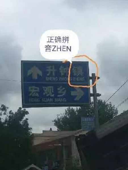 2017年,大河镇到大桥镇之间的杜家井路口的路牌也出现过错误,升钟镇的“镇”字拼音应该是(zhen),上面却写成了(zheng)。