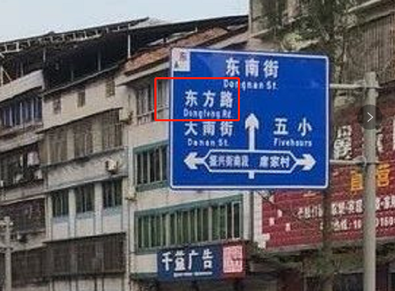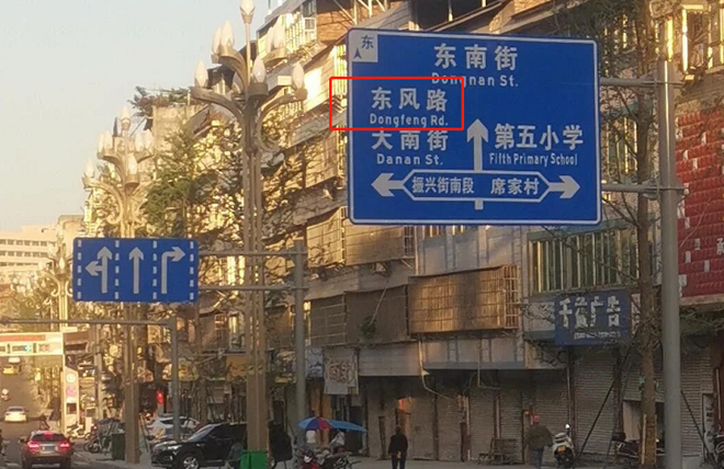 2021年5月,南部县嘉陵路与振兴街南段交叉路口处新安装的道路指标牌上标出了一条“东方路”,在“东方路”下面的拼音却写着“DongFeng”,这到底是东方路还是东风路?