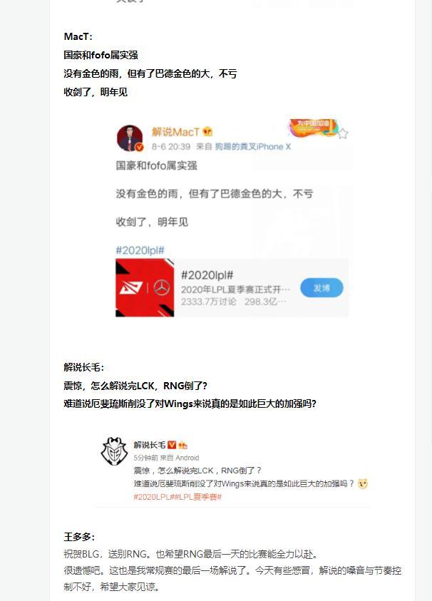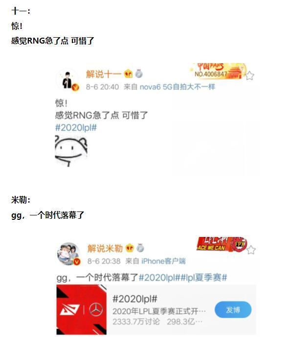 RNG被淘汰后,一众解说发文感叹王朝陨落,令粉丝无比伤感。今年春季赛时,Uzi并未上场,RNG的发挥不佳,粉丝们本来期待着Uzi在夏季赛重振旗鼓,没想到等来的却是传奇永远离开赛场。而RNG也随着Uzi的退役,水平一落千丈。即使在最近几场比赛中,小虎打出了卓越的表现,但也未能挽狂澜于既倒。在夏季赛结束后,小虎很有可能也要宣布退役,RNG王朝彻底没了!