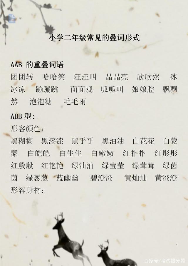 接下来,是我为孩子们准备的一份二年级的常见叠词形式,希望可以帮助到大家!二年级语文:常见的ABB+AABB+ABAC+ABAB等叠词汇总,替孩子存一份!。二年级语文:常见的ABB+AABB+ABAC+ABAB等叠词汇总,替孩子存一份!