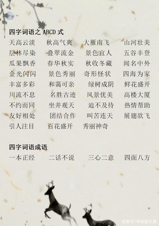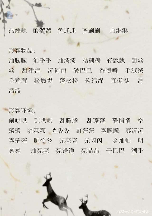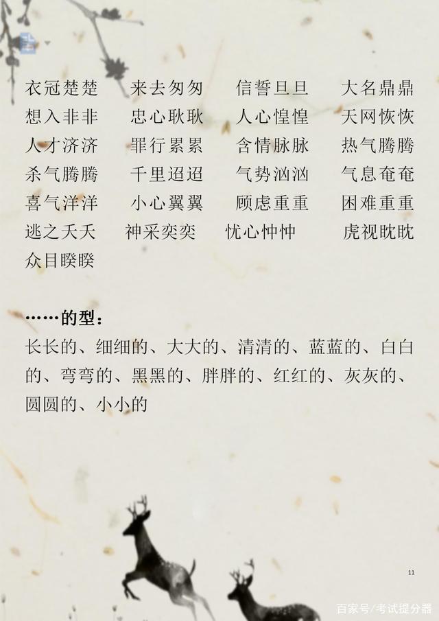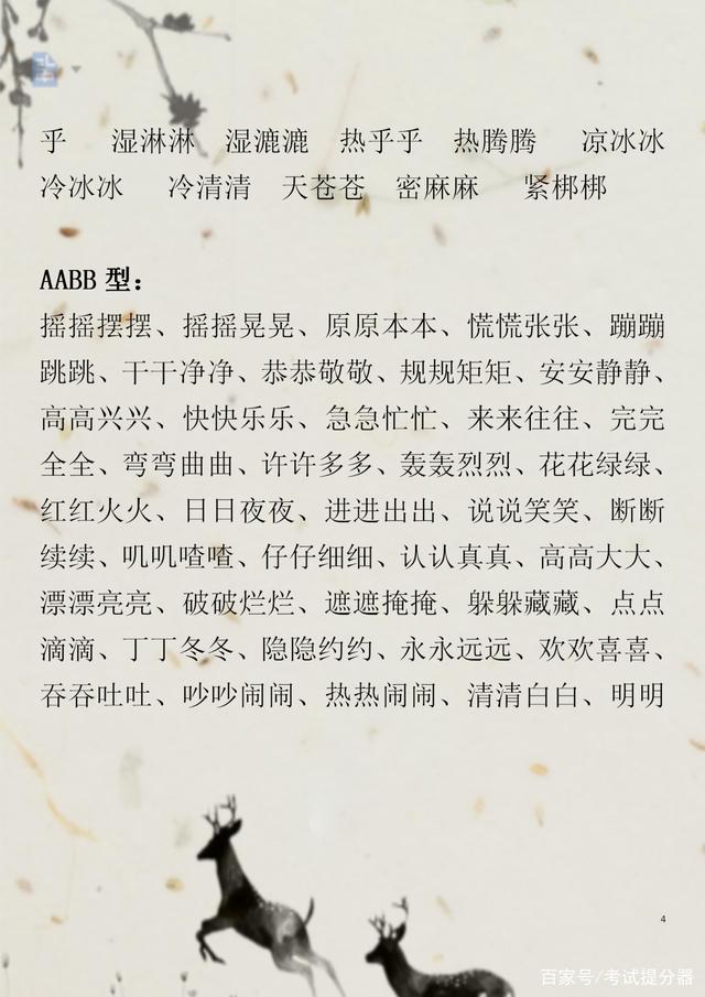 一些生字词,常见的一些ABB+AABB+ABAC+ABAB的词汇等等,都是考试中的重点,所以希望家长要引起重视,在辅导孩子的时候要注重积累。